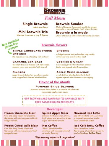 The Brownie Bar Café is at your service to enhance your brownie experience any time of the year.